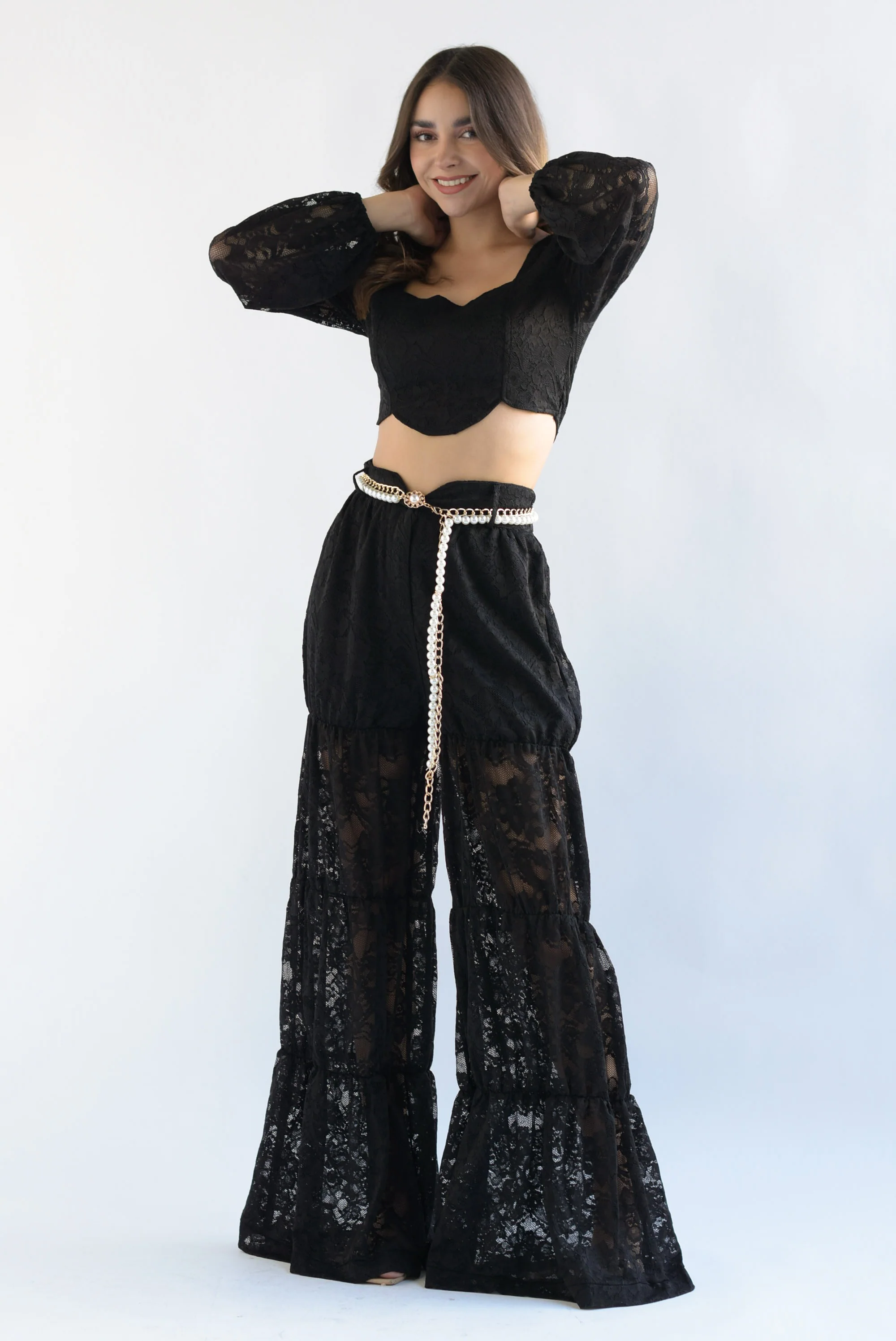 Set Pantalón y Top cinturón perlas encaje Negro