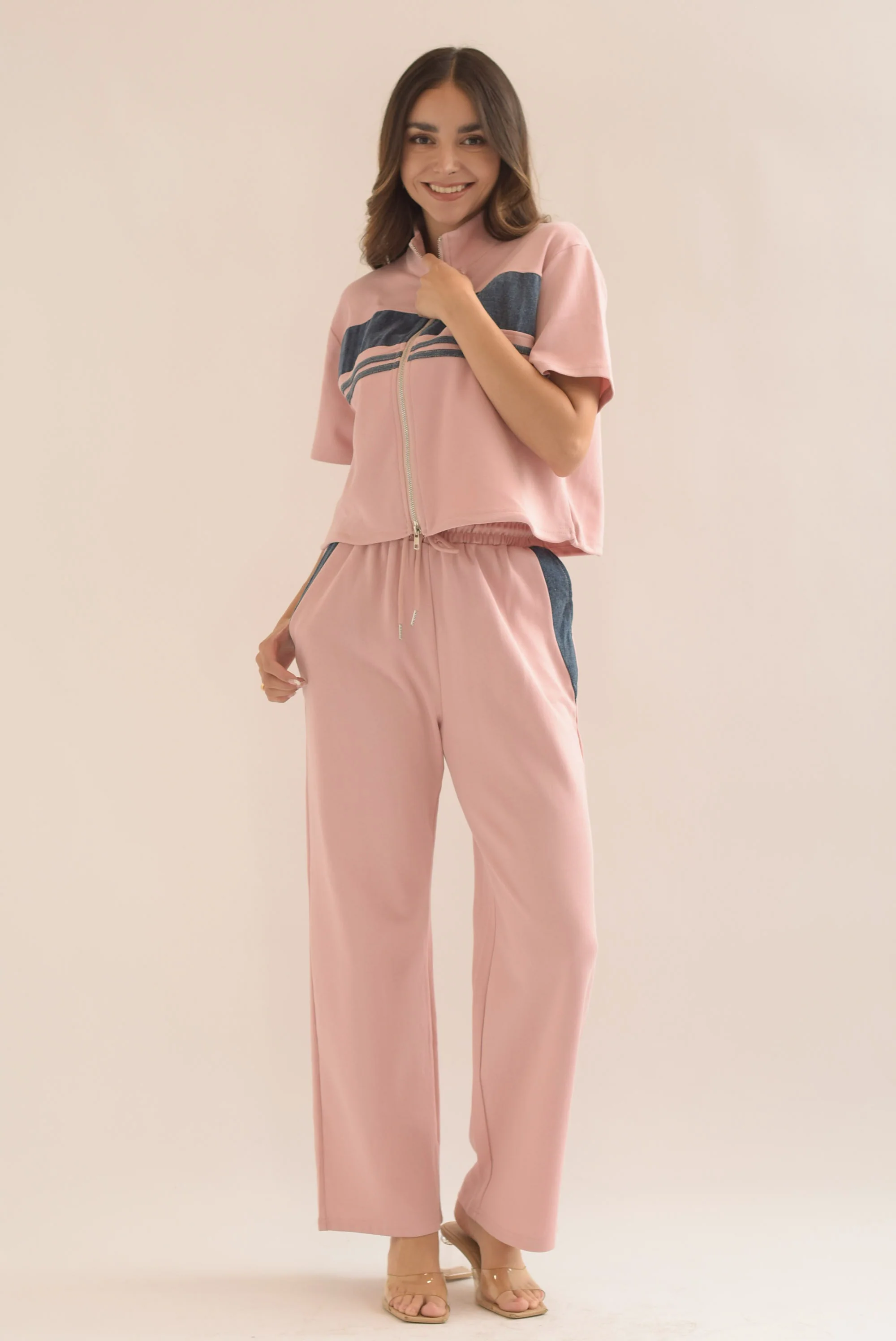 Set Pantalón y Chamarra manga corta franjas denim Rosa