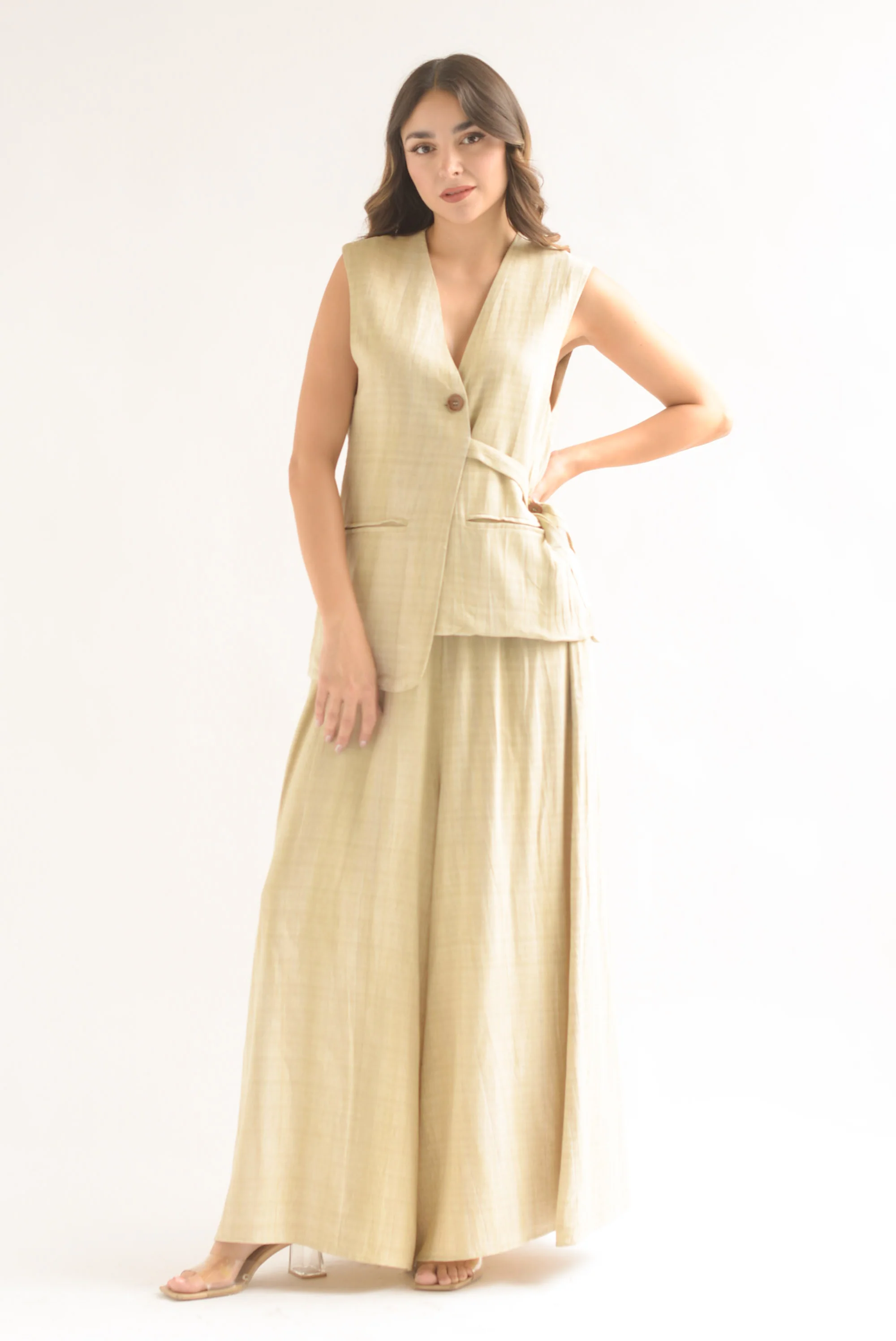 Set Pantalón super wide y Chaleco largo lino Verde Olivo