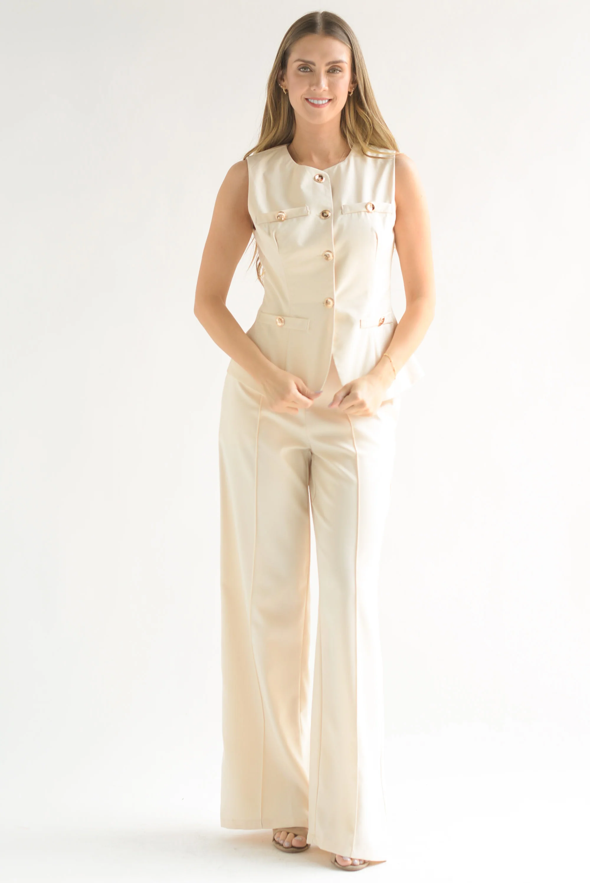 Set Pantalón y Chaleco largo botones dorados Beige