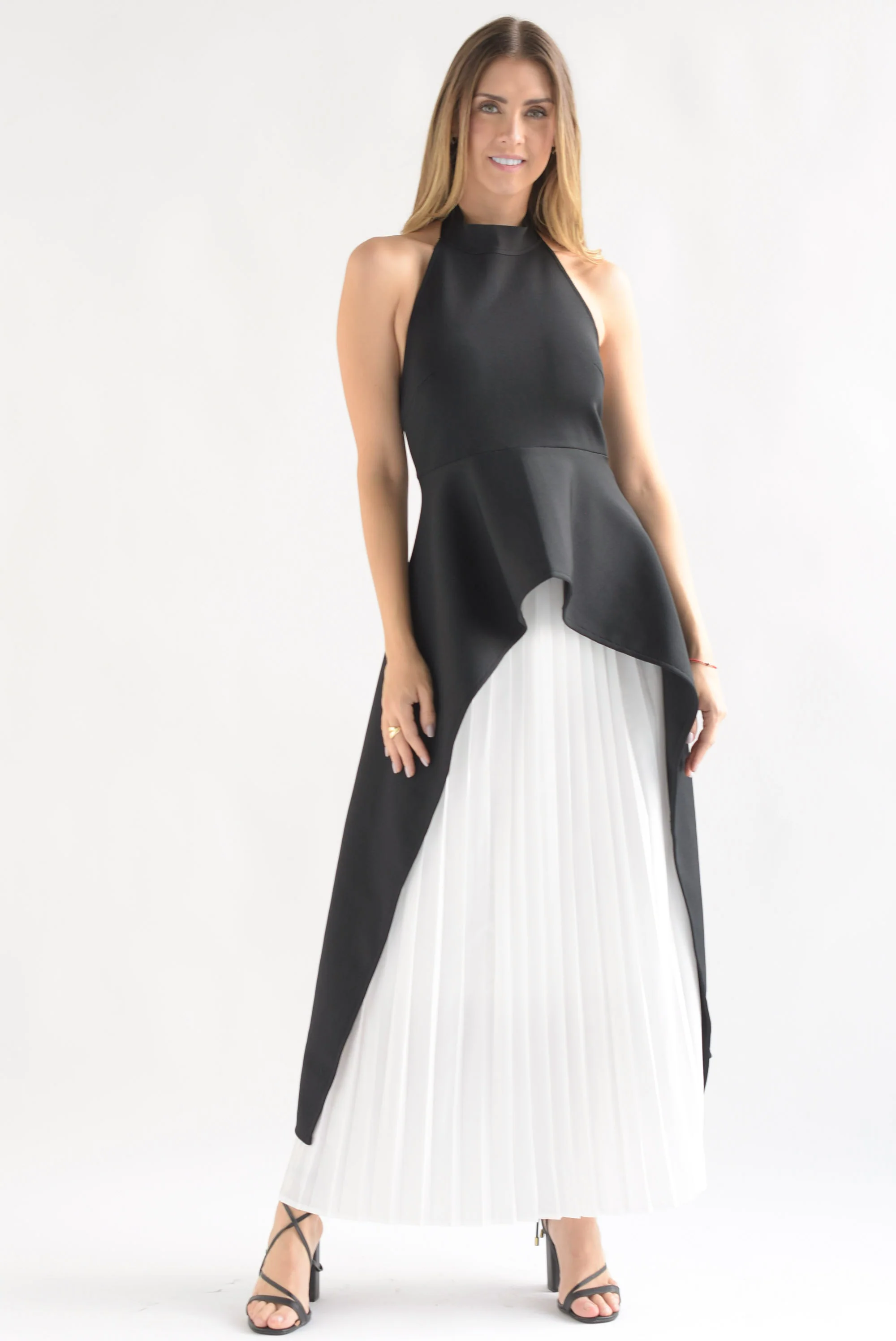 Set Falda plisada Blanco y Blusa asimétrica Negro