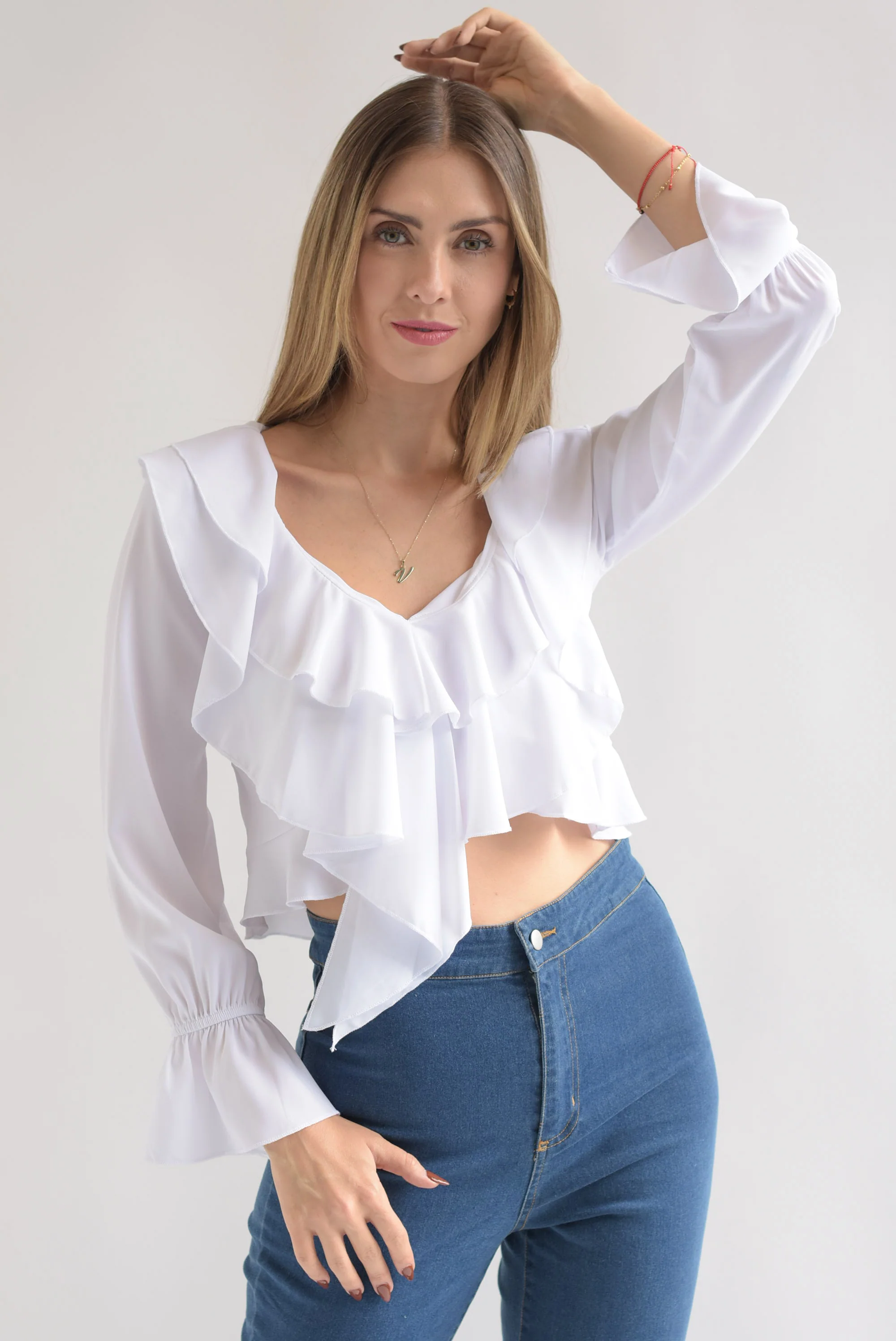 Blusa corta manga larga olanes Blanco