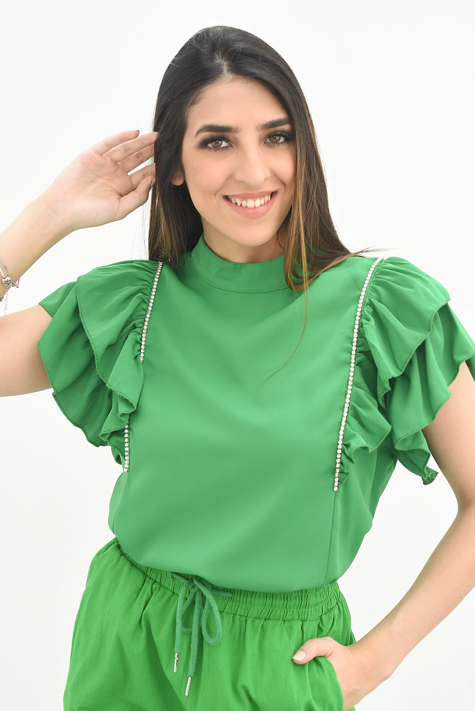 Blusa manga olán brillos Verde
