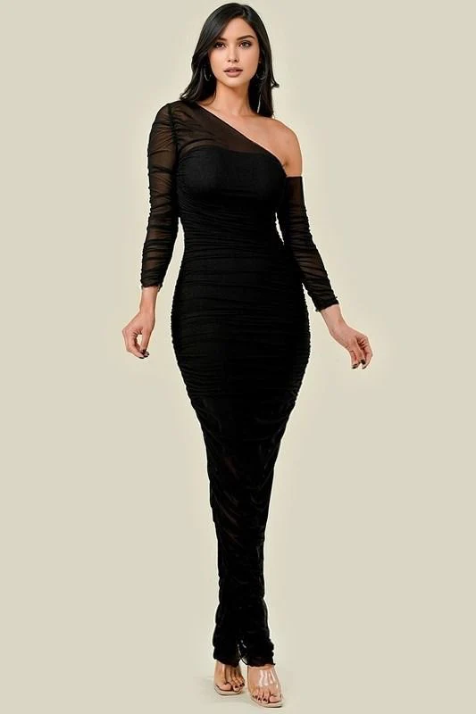 Vestido drapeado asimétrico mesh Negro