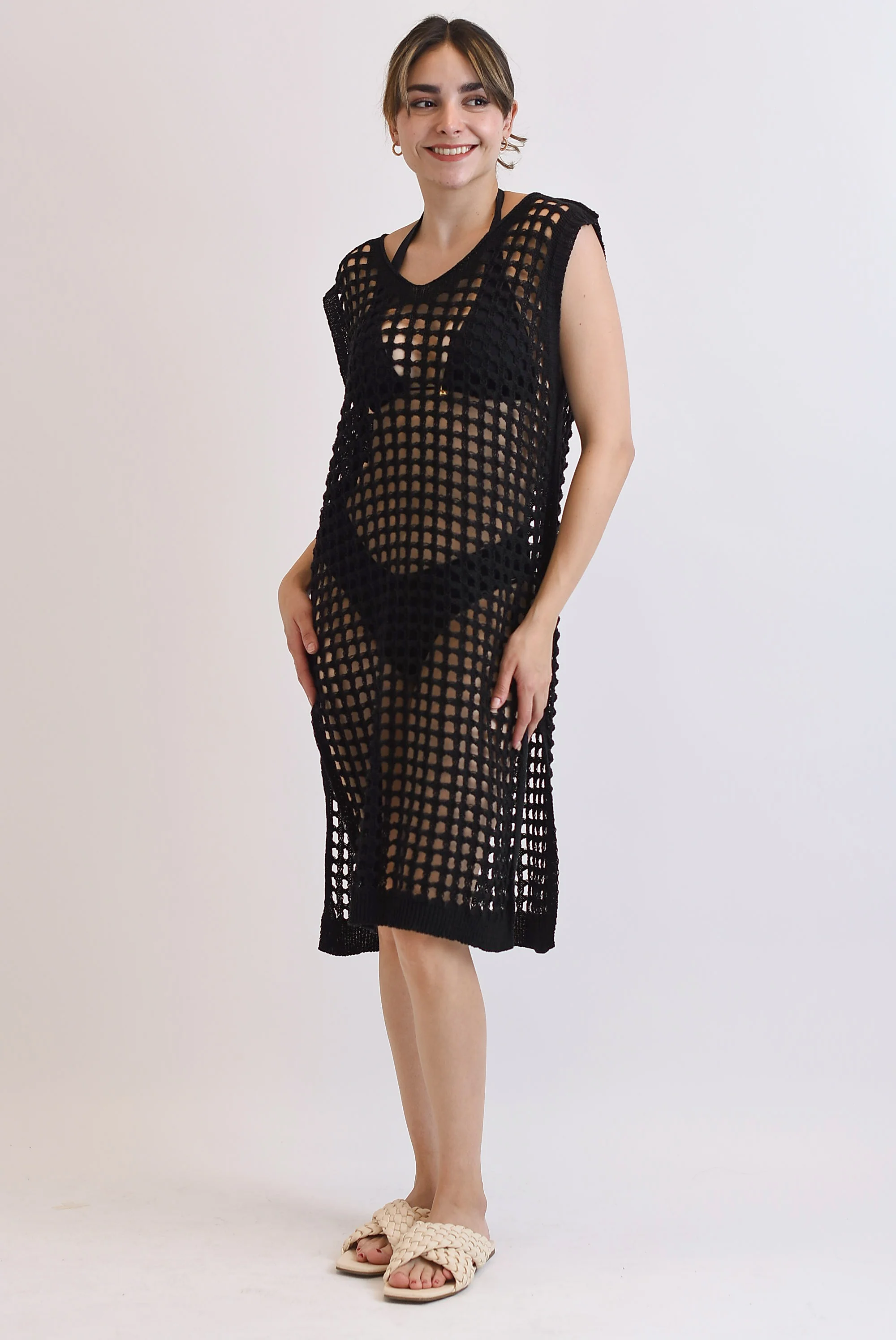 Vestido midi crochet sin manga Negro