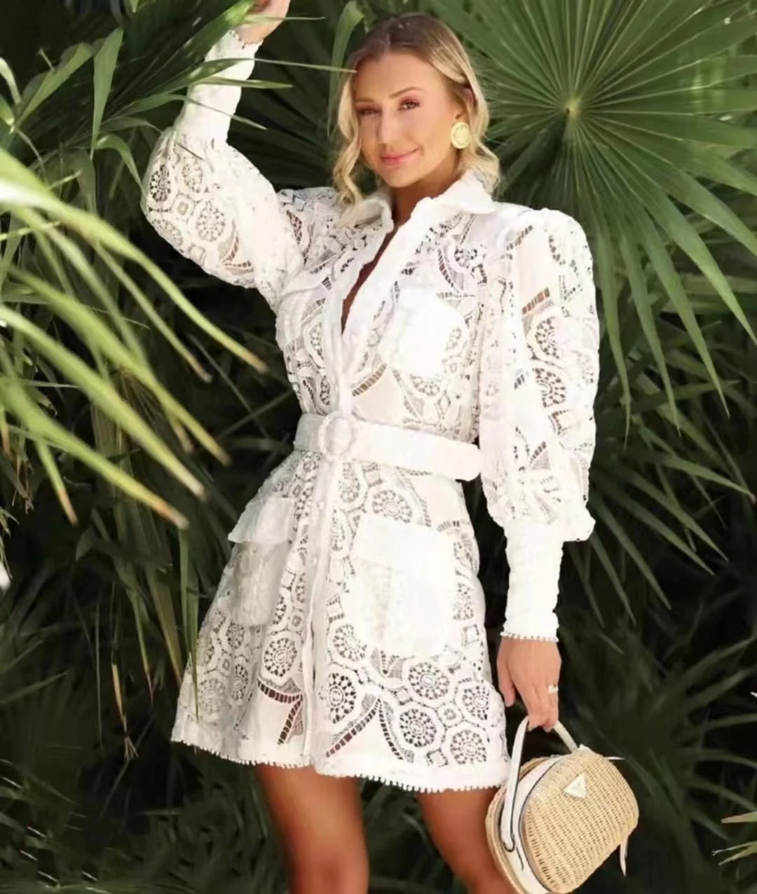 Vestido camisero corto manga larga Encaje Blanco