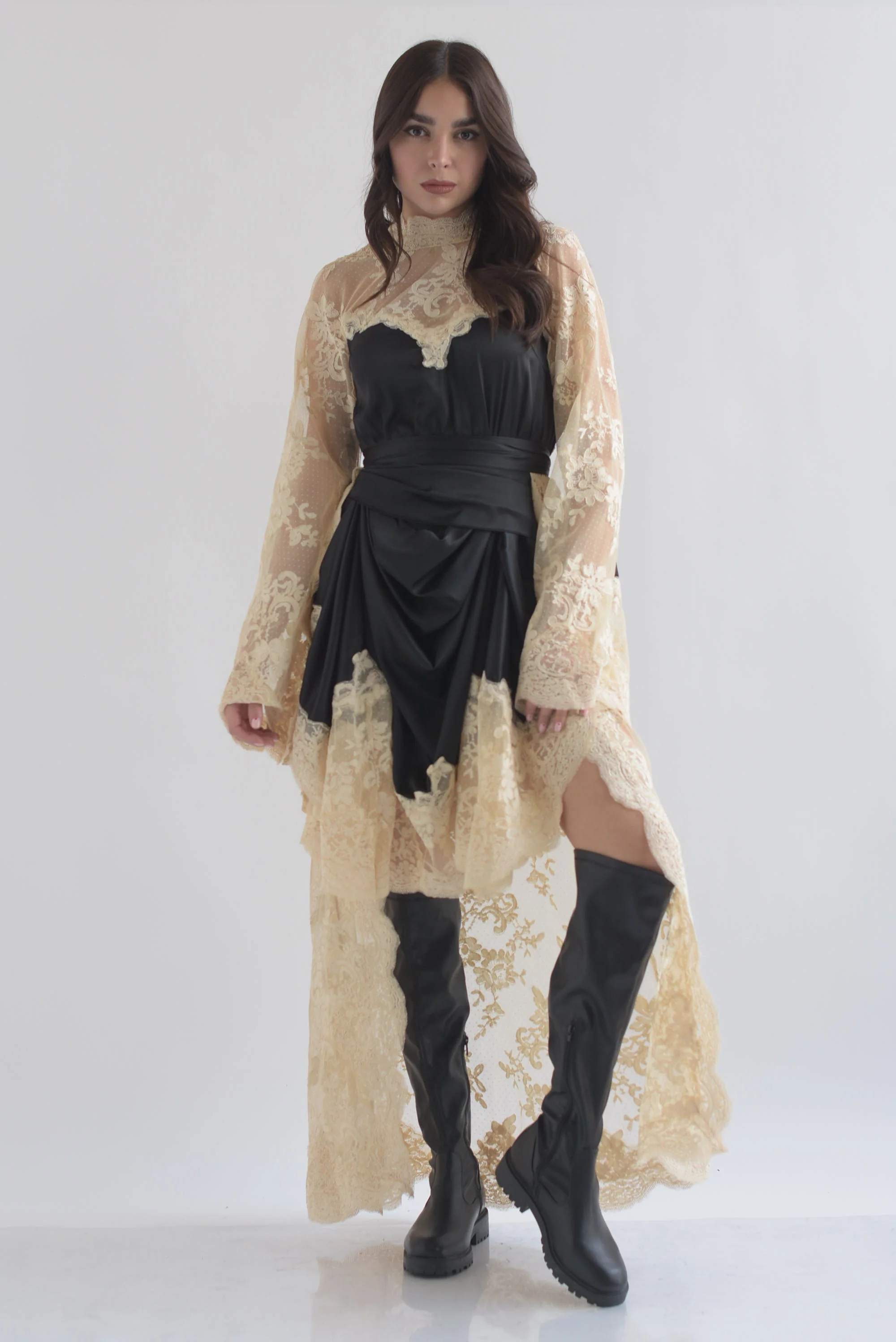 Vestido satín cauda encaje
